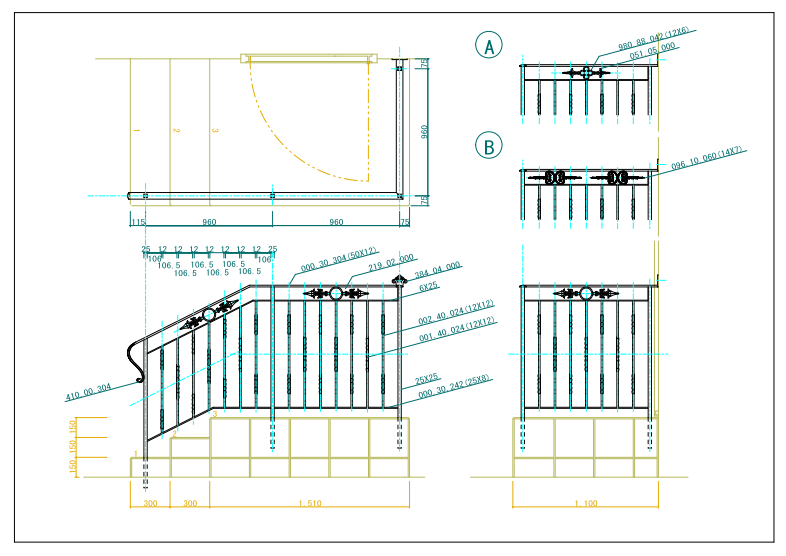 右上図を御覧ください。446.20.042をたて子・親柱際に寄せて配置してみました。お解りのように勾配部分ではたて子左右の唐草がずれて見苦しくなってしまいます。そこで親柱から2本目のたて子にパターンを移動し、勾配部は更にサブレールの上のたて子が勾配と鉛直になるようにしてみましたらうまく納まりました。唐草を上下逆さ使いにしてみても表情が変わってまた面白いと思います。