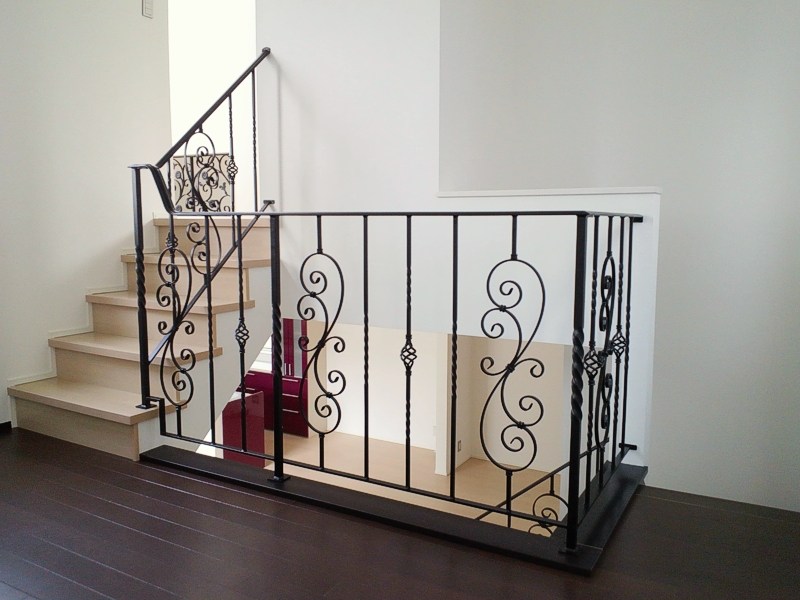 AB01 階段手摺、吹抜け手摺 概要: 新築住宅の1Fから中2階、2Fまでの階段とロク手摺です。 施主: F様邸 所在地: 埼玉県川口市 鍛鉄デザイン: レッキーメタルオーナメントジャパン 製作協力: アップセットファクトリー 鍛鉄監理: ファステート たて子パネルとバスケットのたて子を並べたデザイン