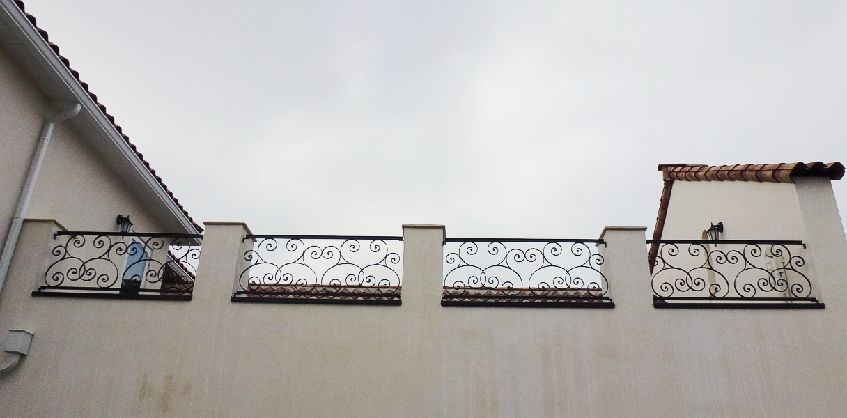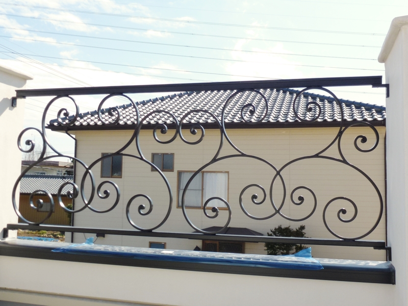 AB06 階段手摺、バルコニー手摺、格子扉、フェンス 概要: 新築注文住宅の各種ロートアイアンを製作しました。海外建築誌の事例写真資料をもとにロートアイアンパーツが利用できるようアレンジしながら、しかも縦横プロポーションの違いを考慮する手間のかかるデザイン作業となりました。 施主: S様邸 所在地: 埼玉県杉戸町 鍛鉄デザイン: Redhouse、レッキーメタルオーナメントジャパン、レッキーメタルオーナメント北京 製作協力: アイアンバナナ、川内工業 鍛鉄監理: Redhouse 建築・施工: Redhouse 吹抜けのR階段手摺とロク手摺。その他外回り金物など