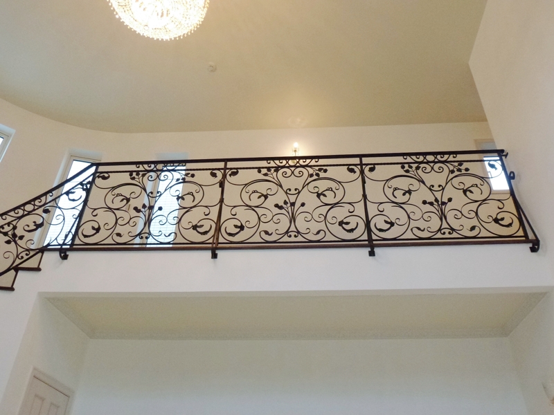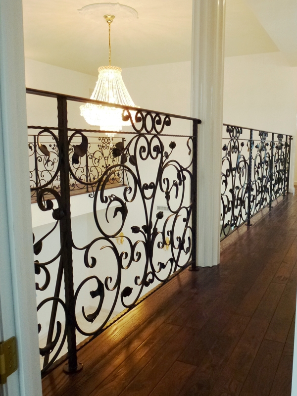 AB12 階段手摺、ロク手摺、バルコニー手摺、キャノピー、門扉、アーチ、スリット格子 概要: 大型の注文住宅の各種ロートアイアンです。室内の階段、ロク手摺をはじめ、ルーフバルコニー列柱間の手摺、玄関キャノピー、組柱とアーチのある門扉、壁スリットの格子などを製作しました。 施主: H様邸 所在地: 埼玉県戸田市 鍛鉄デザイン: レッキーメタルオーナメントジャパン、レッキーメタルオーナメント北京 製作協力: 川内工業、アイアンバナナ、唐絵 鍛鉄監理: Redhouse 建築・施工: Redhouse 広いホール吹抜けのR階段と廊下の手摺を唐草組みで製作