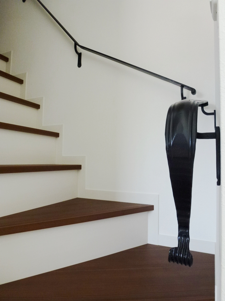 AB16 階段壁付けハンドレール 概要: 住宅メーカー系の新築住宅です。レールエンドは袖がからまないようにとのリクエストがあり、大きな形のものを採用しましたが、勾配が急なために2F端はかなりの曲直しとなりました。 施主: N様邸 所在地: 鍛鉄デザイン:レッキーメタルオーナメントジャパン 製作協力:Kurasima Ironworks 鍛鉄監理:ダイユー 建築・施工:ダイユー 壁付けハンドレール全体