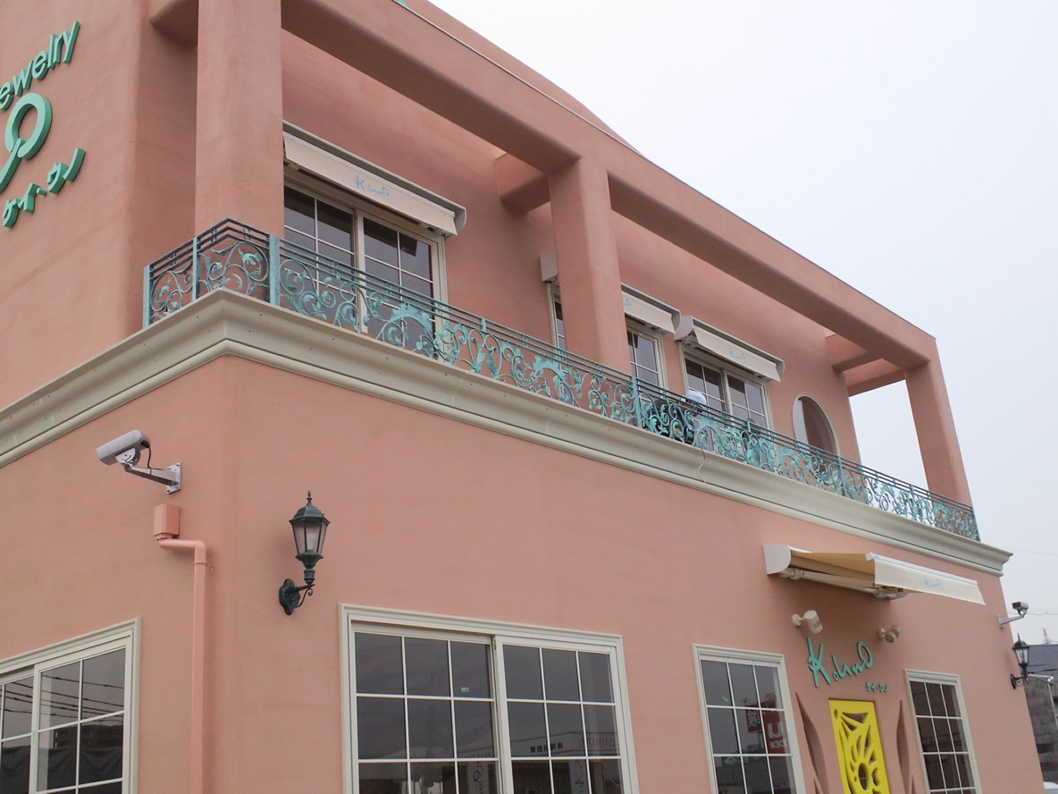 AC01 バルコニー手摺、階段手摺 概要: おなじみのデザインの緑青風塗装のバルコニー手摺と真鍮ギボシが端部についた店内階段手摺、今回は岡山店です。 施主: K-uno岡山店 所在地: 岡山県岡山市 鍛鉄デザイン: K-uno 製作協力: 川内工業 緑青色の2Fバルコニー手摺。店内階段手摺も製作