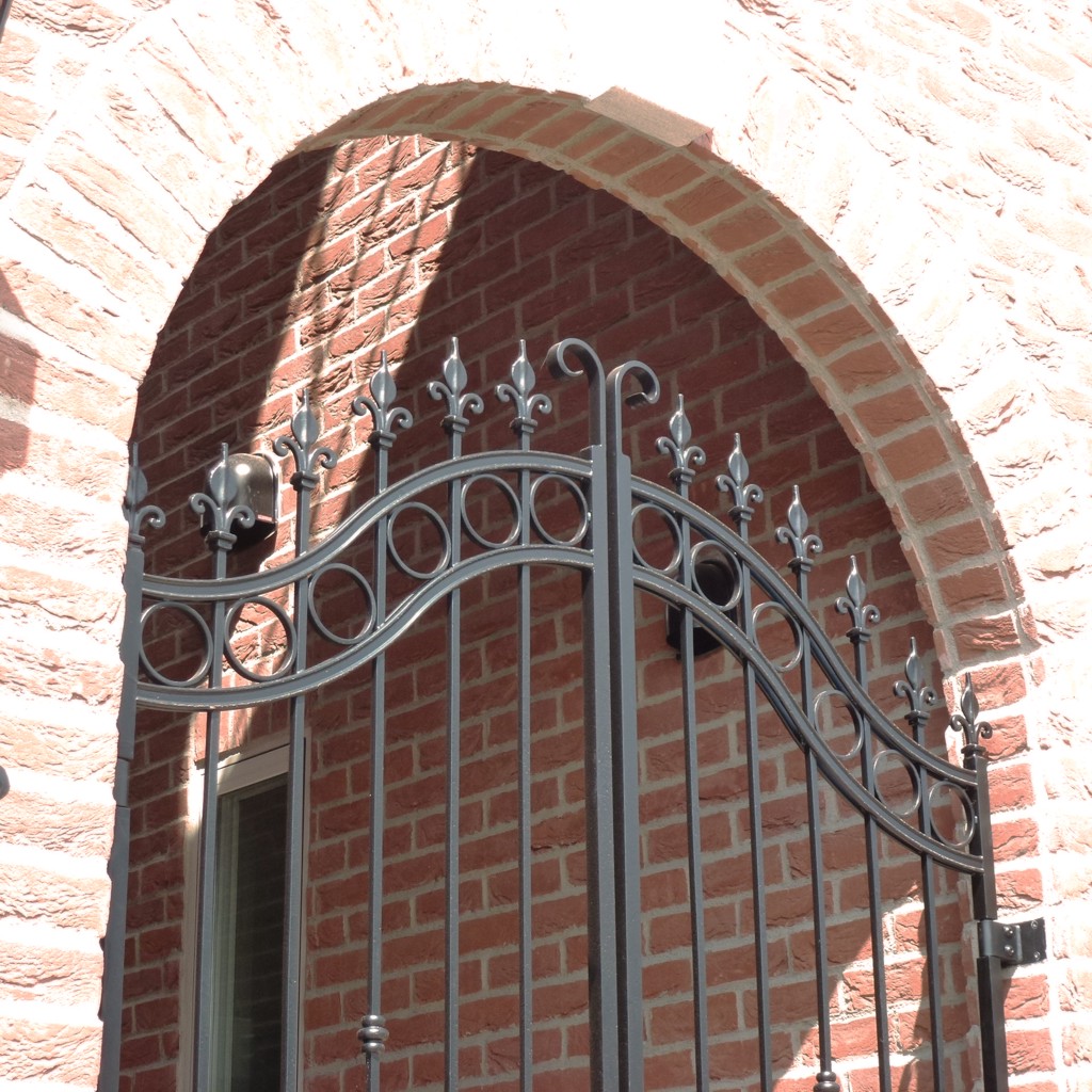 【概要】上下4本の横桟にミゾ形材パーツをつかってヨーロッパの雰囲気を強調しました。 【仕様】レッキーメタルのロートアイアンパーツと国内鋼材を加工溶接組立。溶融亜鉛メッキ防錆後黒半ツヤ塗装仕上。 【寸法】2,380H X (730+730)W 164.05.000(剣先) 000.30.154(ミゾ形長尺材) 353.31.042(リング) 463.20.042(唐草) 582.20.024(唐草) 555.05.024(ブッシュ) 386.02.000(レバーハンドル) 775.04.000S(軸吊りヒンジ) 780.04.000S(ピボットヒンジ) アイテムサムネイル
