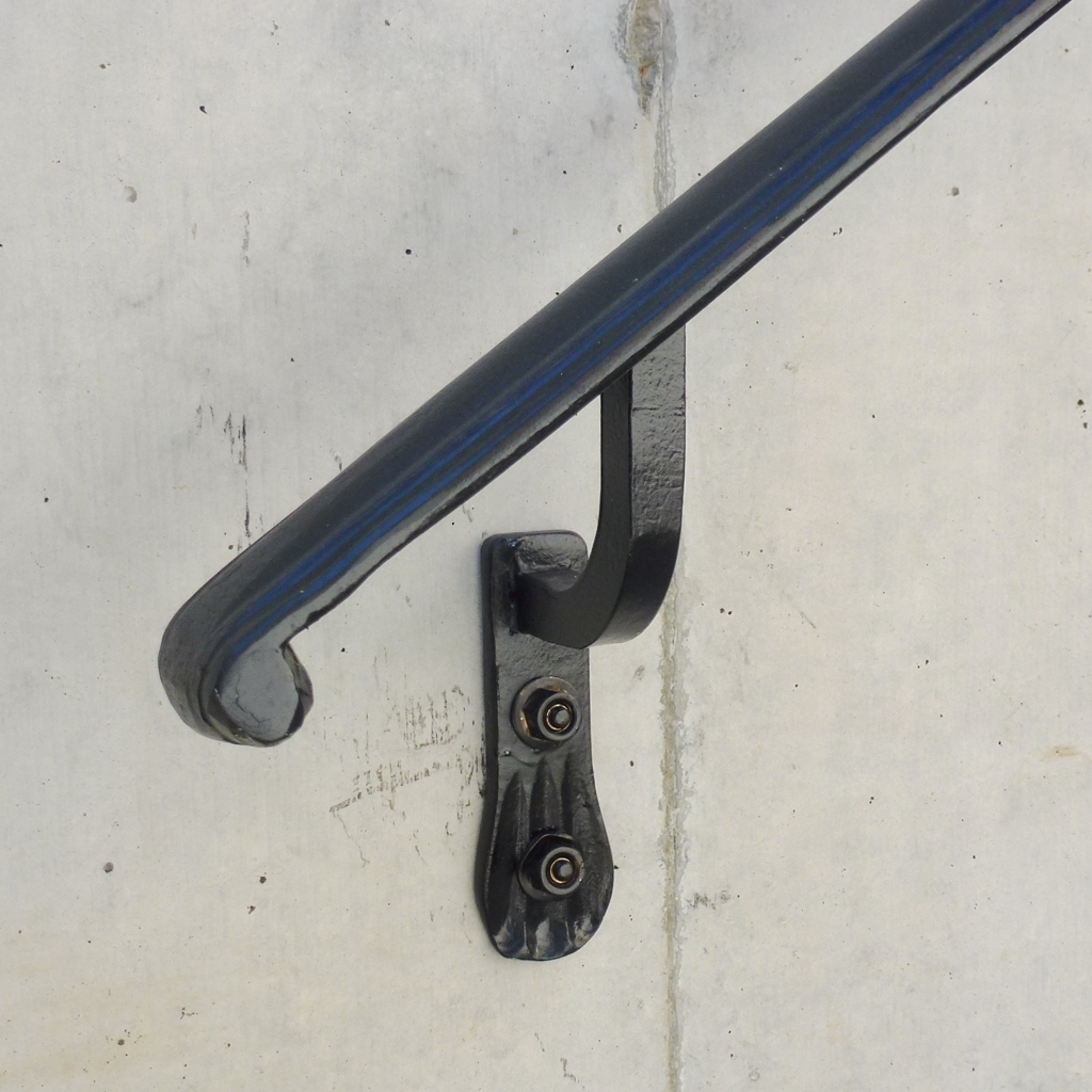 【概要】アプローチ階段の壁付けハンドレールです。最上部は壁がありませんので親柱を建てました。 【仕様】レッキーメタルのロートアイアンパーツと国内鋼材を加工溶接組立。溶融亜鉛メッキ防錆後黒半ツヤ塗装仕上。 【寸法】3,450L 段端から800Hに取付け 000.30.304(ハンドレール) 429.00.304(レールエンド) 130.04.025(持出しブラケット) 301.47.029(親柱) 332.04.000(ベースプレート) アイテムサムネイル