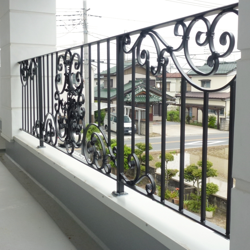 概要: 2Fインナーバルコニーの手摺です。大きな唐草パネルをたて子手摺にアレンジして、見た目よりはリーズナブルな加工費で済みました。取付けも現場の大工さんが行いました。左右の壁取付け部の受け金物を左官仕上前に先付けしたので、スッキリした取付部になりました。