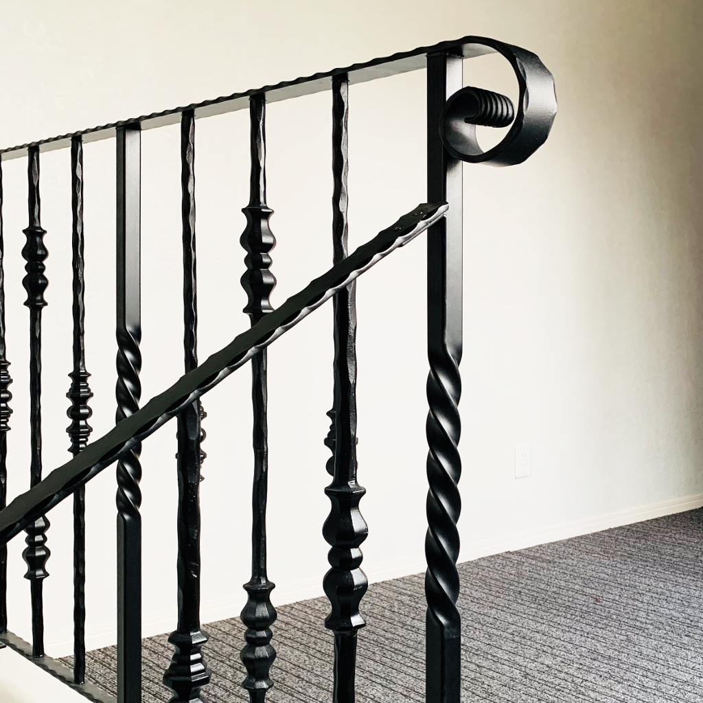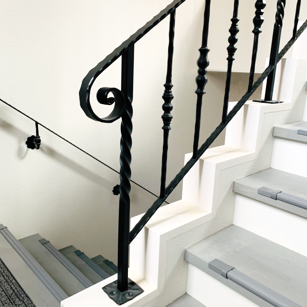 概要: 宿泊施設の折返し階段の階段手摺とそれに続くロク手摺及び壁付けハンドレールです。ジョイント金具は独自加工しましたが、その他すべてレッキーメタルのパーツの組合せだけで出来ています。特に、階段手摺はたて子デザインのオーソドックスなものですが、Φ16のエアハンマー加工製を使用したので、ロートアイアンの重厚な感じがよく出ました。