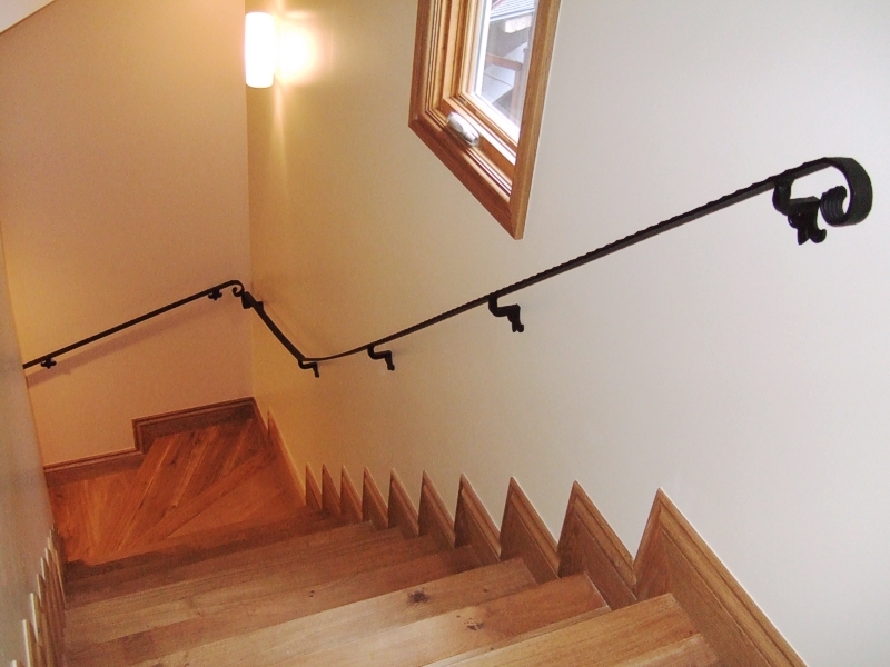 AJ06 階段壁付けハンドレール 概要: 1-2F階段壁伝いにハンドレールを取付けました。昇り端にも小さな手すりがあります。 施主: E様邸 所在地: 横浜市 鍛鉄デザイン: レッキーメタルオーナメント北京 製作協力: 川内工業 鍛鉄監理: ブローニーブラウニー 1F昇り端から曲り角