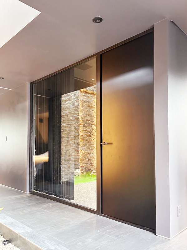 - 概要: 住宅正門扉。塀の施工前に先行して扉枠を取り付けました。ヒンジの右側にはポストやインターホンが組込まれたパネルがあります。