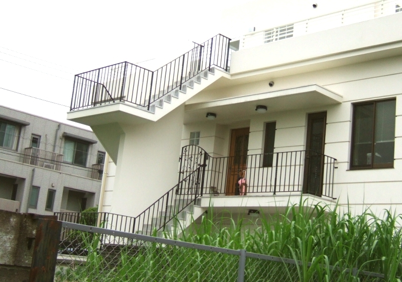 JG05 バルコニー手摺、階段手摺、格子扉 概要: 住宅のバルコニー手摺、外部の階段手摺、テラス手摺、格子扉(門扉)です。 施主: K様邸 所在地: 東京都中野区 鍛鉄デザイン: レッキーメタルオーナメントジャパン 製作: レッキーメタルオーナメン北京 隣地側から外部階段、テラス手摺を見る